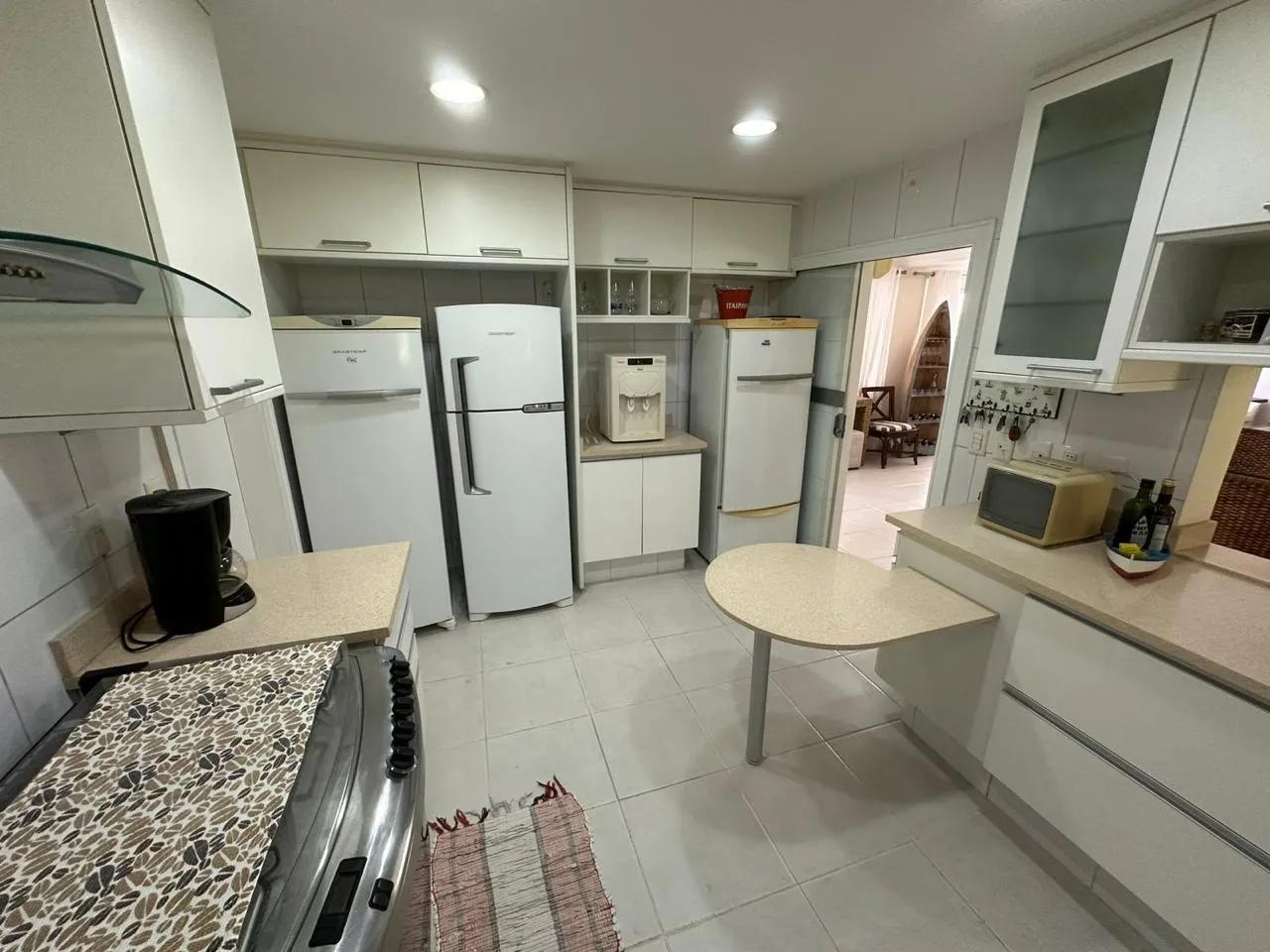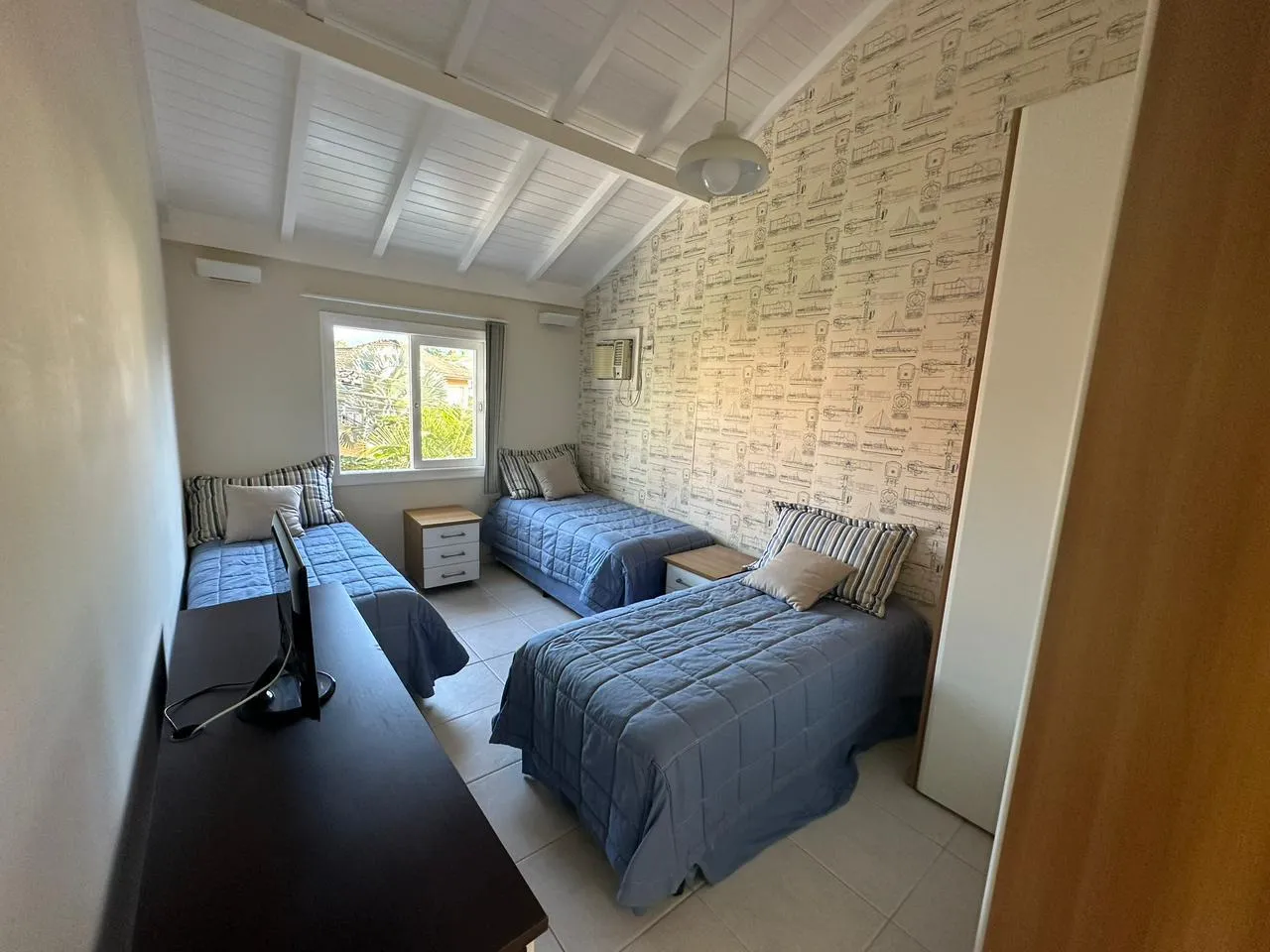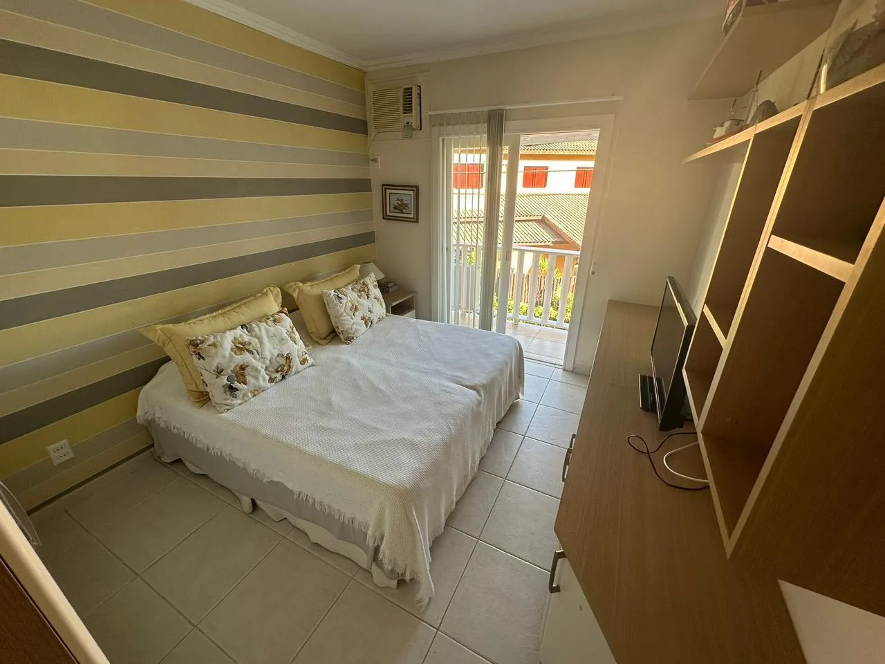 Área Interna da Casa: Sala de estar e jantar ampla, 2 suítes, 2 quartos ar-condicionado em todos os cômodos, internet, TV, e cozinha equipada.