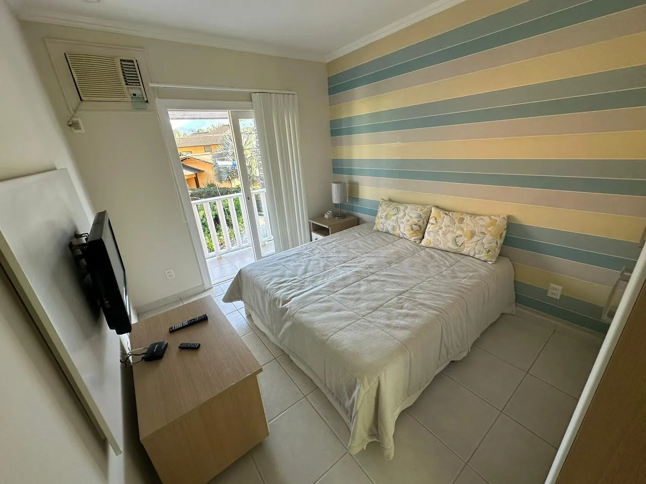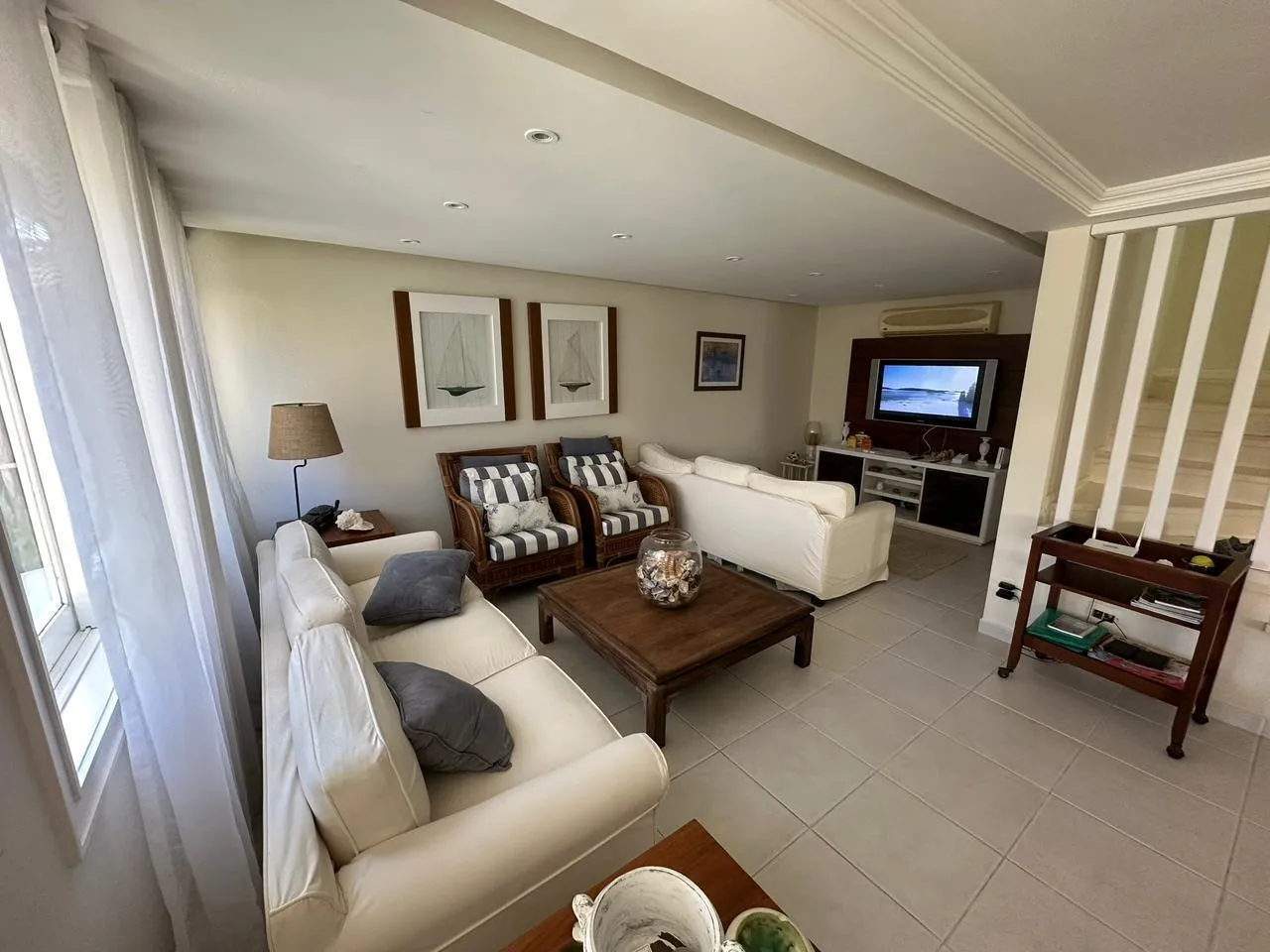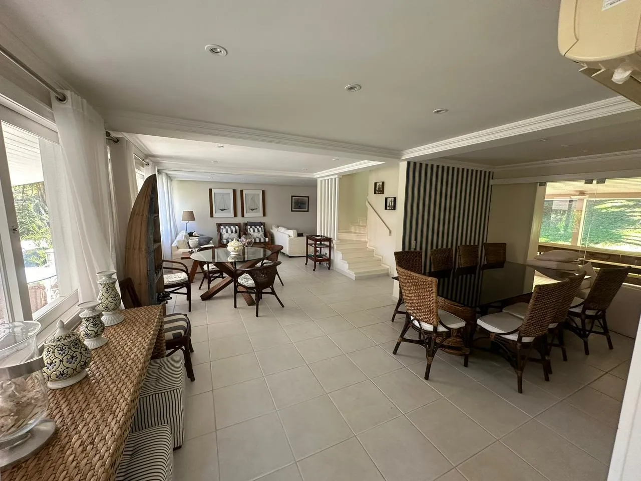 Área Interna da Casa: Sala de estar e jantar ampla, 2 suítes, 2 quartos ar-condicionado em todos os cômodos, internet, TV, e cozinha equipada.
