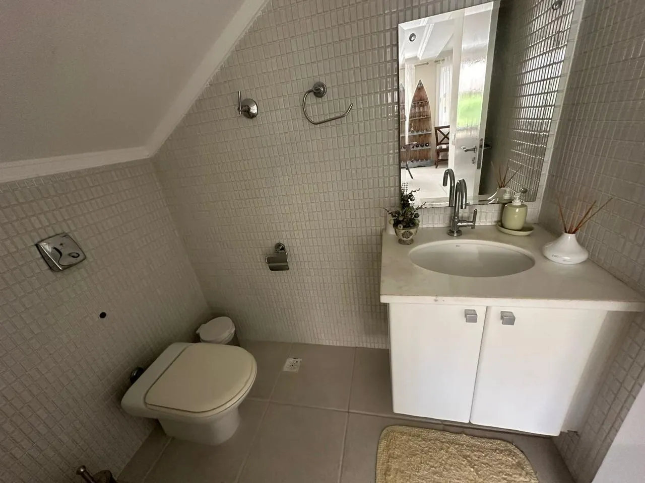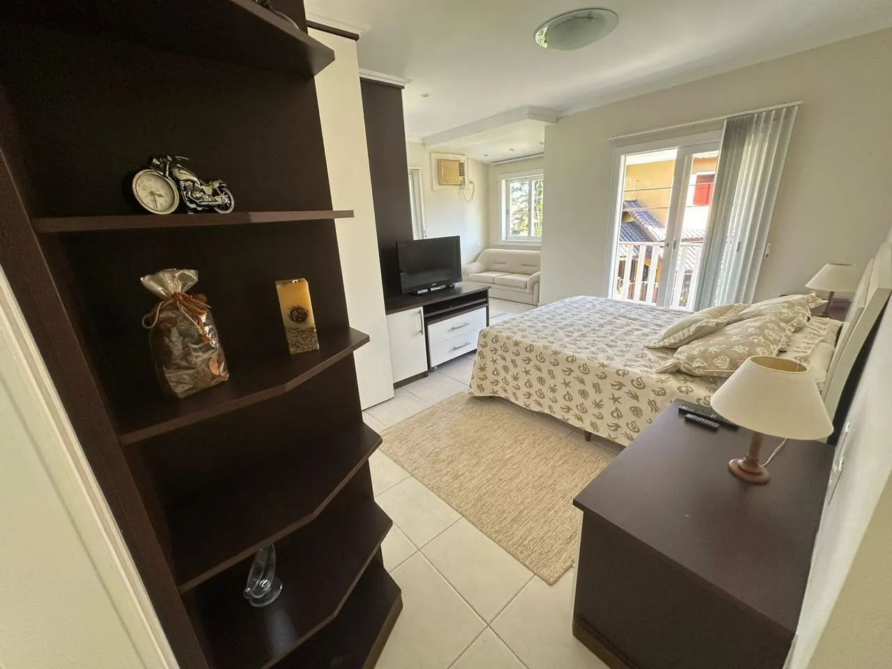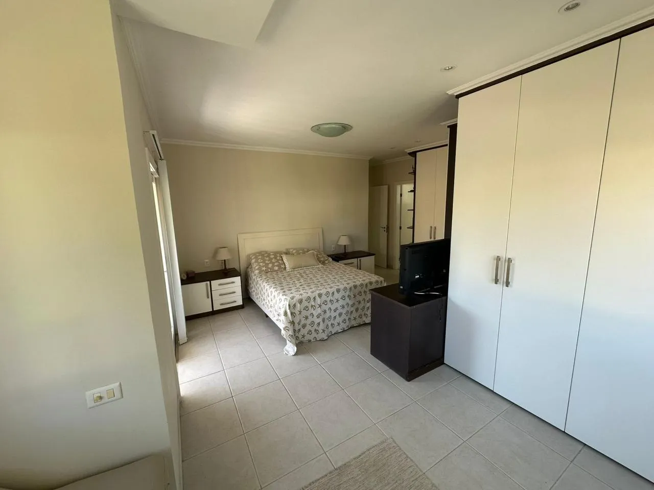 Área Interna da Casa: Sala de estar e jantar ampla, 2 suítes, 2 quartos ar-condicionado em todos os cômodos, internet, TV, e cozinha equipada.